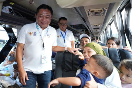 Momen Momen Mudik Asyik Bersama BUMN 2024: TelkomGroup Berangkatkan 2.000 Lebih Pemudik Direktur Utama Telkom Ririek Adriansyah (depan) didampingi Direktur Utama Telkomsel Nugroho (belakang) saat berinteraksi dengan...