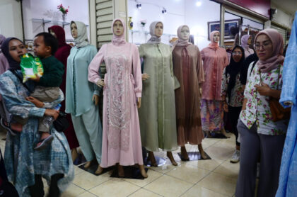 Momen Momen Lebaran 2024, Tren Beli Baju Lebaran Menurun Suasana sentra pakaian muslim di Balubur Town Square (Baltos) Bandung, akhir pekan lalu. Mandiri Spending...