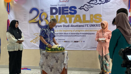 Momen Momen Himpunan Mahasiswa Prodi Akuntansi FE Unkris Gelar Accounting Fair 2024 Dekan Fakultas Ekonomi (FE) Universitas Krisnadwipayana (Unkris) Dr Imam Wibowo memotong tumpeng pada puncak Dies...