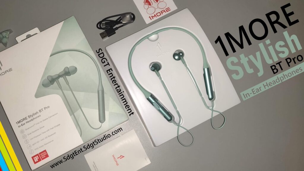 Seperti 1MORE Stylish BT Pro In-Ear Headphones yang hadir bersama boks berwarna putih dengan sentuhan warna hitam dan sedikit warna merah di bagian depannya. Di bagian depan kanan terdapat gambar 1MORE Stylish BT Pro In-Ear Headphones, sementara di bagian kiri depan terdapat tulisan nama produk โ1MORE Stylish BT Pro In-Ear Headphonesโ, โQualcomm Chip for Stable Connectionโ, โDual-Dynamic Driverโ, 12H Playback Time with Fast Chargeโ, โaptX HD/AAC HD Bluetoothโ dan โIPX5 Water Resistanceโ.