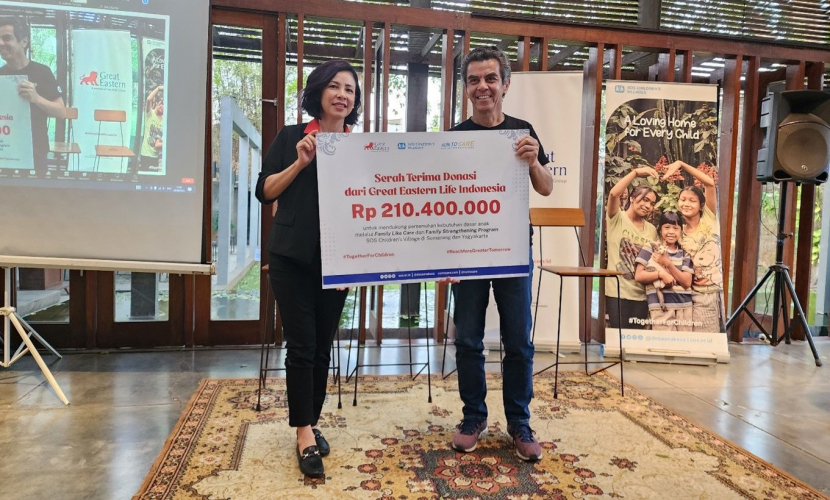 Nina Ong (Direktur Bancassurance Great Eastern Life Indonesia/kiri) dalam seremonial penyerahan donasi untuk Run To Care 2023 bersama dengan Gregor Hadi Nitihardjo (National Director SOS Children’s Villages Indonesia) pada 29 September 2023 di Dia.Lo.Gue, Kemang, Jakarta Selatan. (Foto: Great Eastern Life Indonesia)