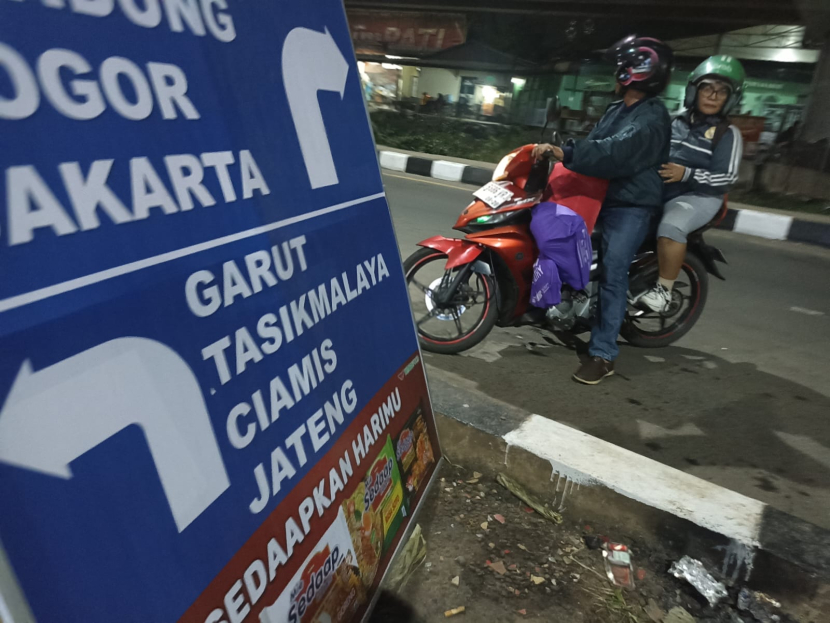 Pemudik bersepeda motor berhenti setelah salah mengambil jalur jalan menuju arah Garut, Tasik dan Ciamis di persimpangan Jl Raya Cileunyi – Rancaekek, Bandung, Ahad (7/4/2024). (Foto: Yogi Ardhi/Republika Network).