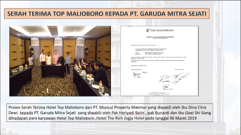 “Aset Hotel Top Malioboro tersebut telah dicatatkan dalam Laporan Keuangan Perseroan dan disetujui serta disahkan oleh 90 persen Pemegang Saham PT GMS termasuk Pelapor (AJ),” tegas Dewi.