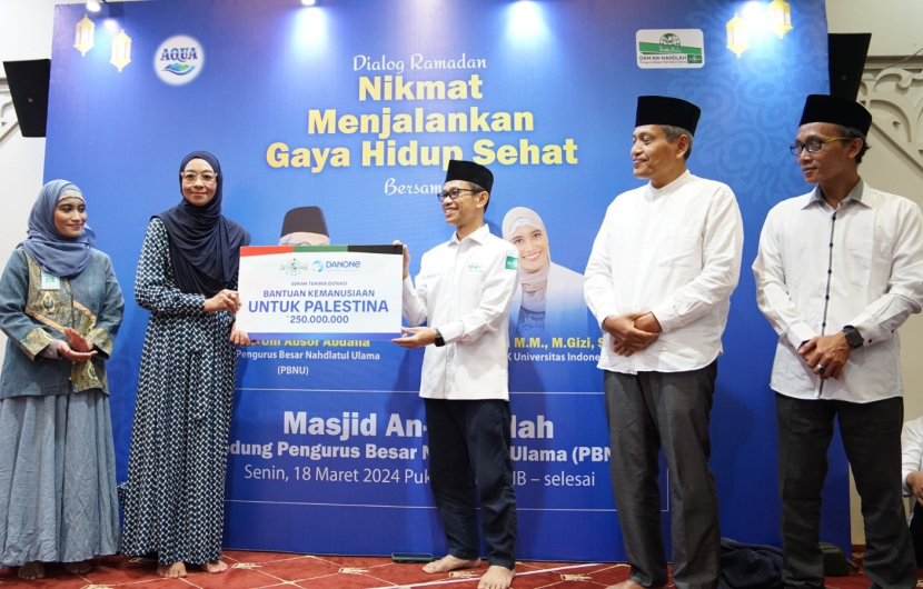 NEWS — Lembaga Amil Zakat Infaq dan Shadaqah Nahdlatul Ulama (LazisNU) kembali menerima donasi dari Aqua untuk disalurkan sebagai bantuan kemanusiaan untuk Palestina. Donasi tersebut diserahkan langsung oleh VP General Secretary Danone Indonesia, Vera Galuh Sugijanto, bersamaan dengan Safari Ramadan di Masjid An Nahdlah, PBNU, Senin (18/3/2024).