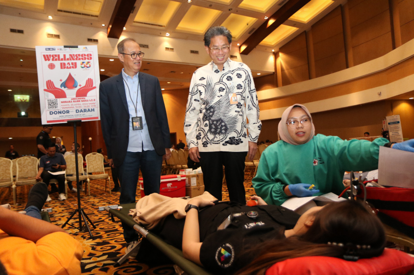Direktur Utama Bank Mega Kostaman Thayib (kanan) dan Direktur Utama Allo Bank Indra Utoyo (kiri) menyaksikan pelaksanaan donor darah pada acara Wellness Day Bank Mega di Menara Bank Mega, Kamis (25/4/2024). (Foto : Dok Bank Mega)