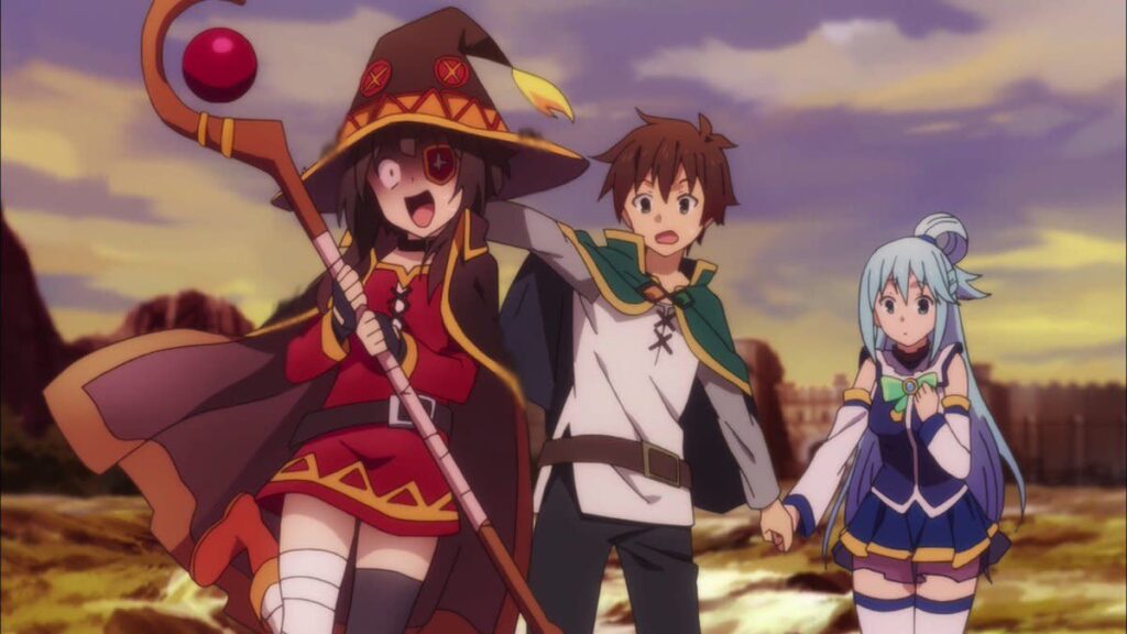 Di dunia fantasi, ia membentuk tim untuk bertarung melawan monster bersama Dewi Aqua, archwizard bernama Megumin, dan crusader bernama Darkness, karena Kazuma dikelilingi gadis cantik, KonoSuba: God’s Blessing on This Wonderful World! seringkali dianggap sebagai serial yang termasuk dalam genre harem.