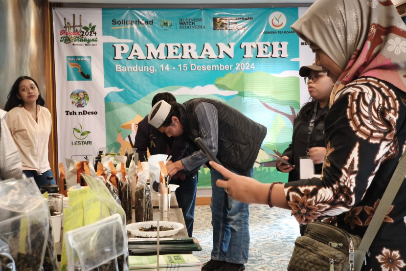 Pengunjung meninjau beragam jenis teh hijau dari berbagai daerah dipamerkan pada kegiatan Pekan Teh Rakyat 2024 di Resto Roemah Kentang 1908 Bandung, Sabtu dan Ahad (14-15/12/2024).