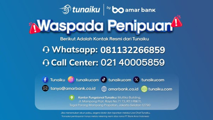 Salah satu contoh penyedia pinjaman legal adalah Tunaiku, produk dari Amar Bank yang telah terdaftar di OJK. Untuk informasi lebih lanjut, termasuk pembatalan pinjaman, hubungi call center Tunaiku di (021) 40005859, Whatsapp Tunaiku di 081132266859, atau email ke cs Tunaiku di tanya@amarbank.co.id.